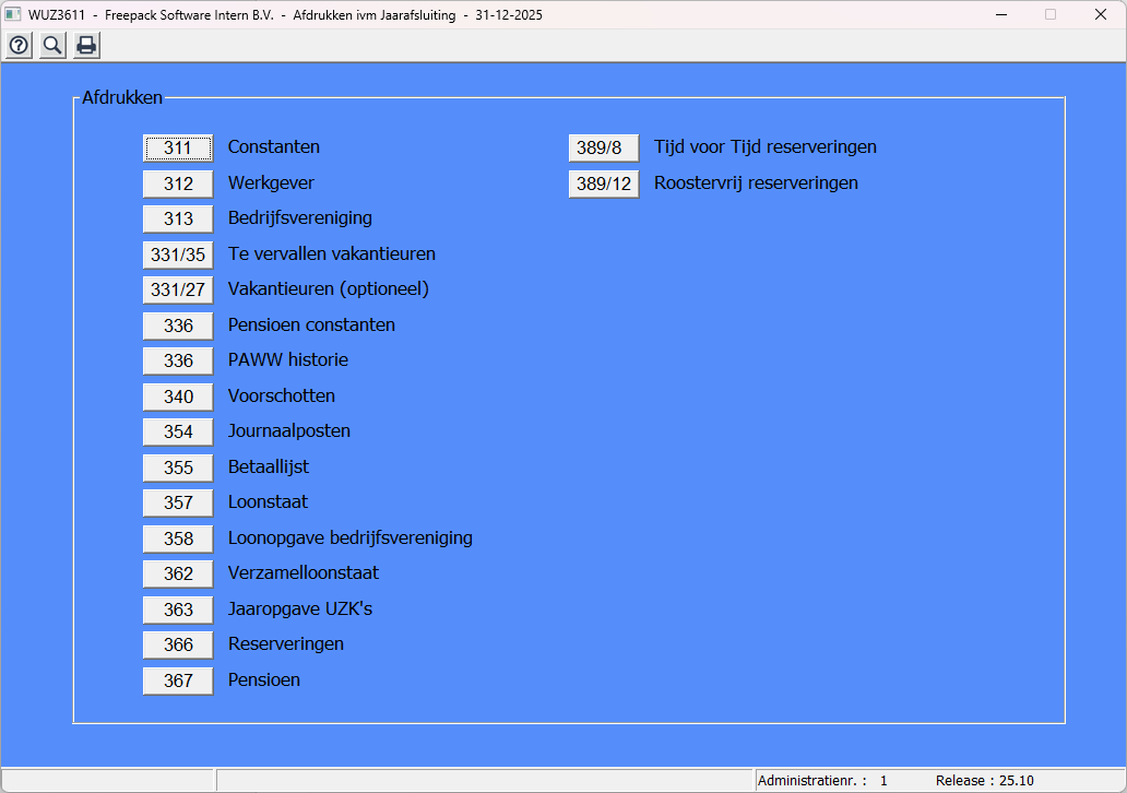 Bij controles door instanties wordt regelmatig gevraagd om de instellingen binnen het systeem zoals die in een bepaald jaar zijn gehanteerd. Wij raden u dan ook aan om de Constanten (programma 311), de Werkgevergegevens (programma 312), voor alle gebruikte BV’s de Bedrijfsvereniginggegevens (programma 313) en de gebruikte pensioenconstanten (programma 336) af te drukken.